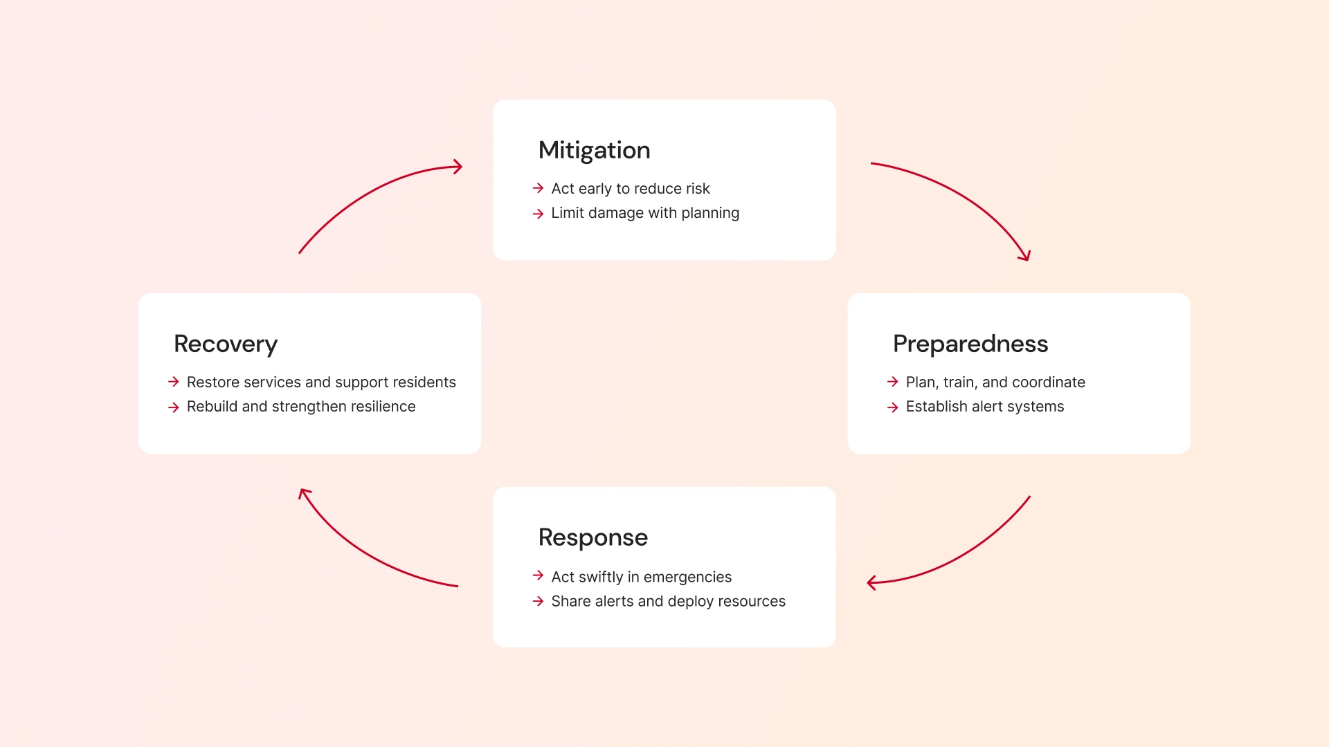 Emergency preparedness is one component of a broader emergency management cycle that guides how communities plan for, respond to, and recover from disruptive events. This cycle helps local governments move from reactive response to coordinated, long-term resilience. It includes four interconnected phases: