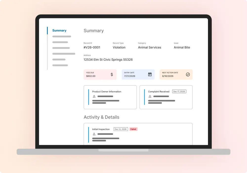 Seamlessly process complaints and track violations within a unified case record, from initial inspection and notice of violation through citation processing, court proceedings, and resolution in a single view.