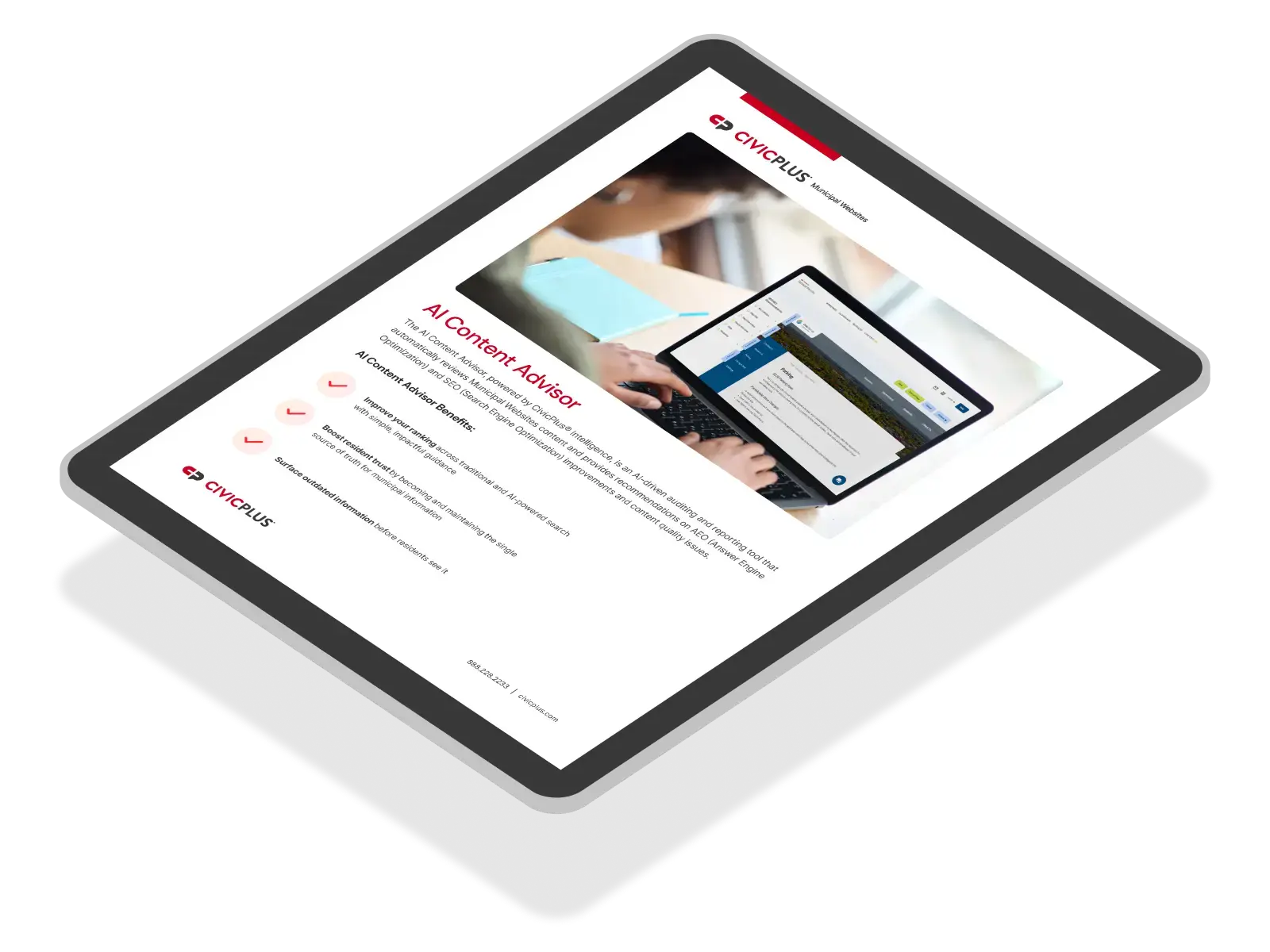 Improve search rank, keep content up to date, and become the trusted source of truth for residents with the Municipal Websites AI Content Advisor, powered by CivicPlus® Intelligence.
