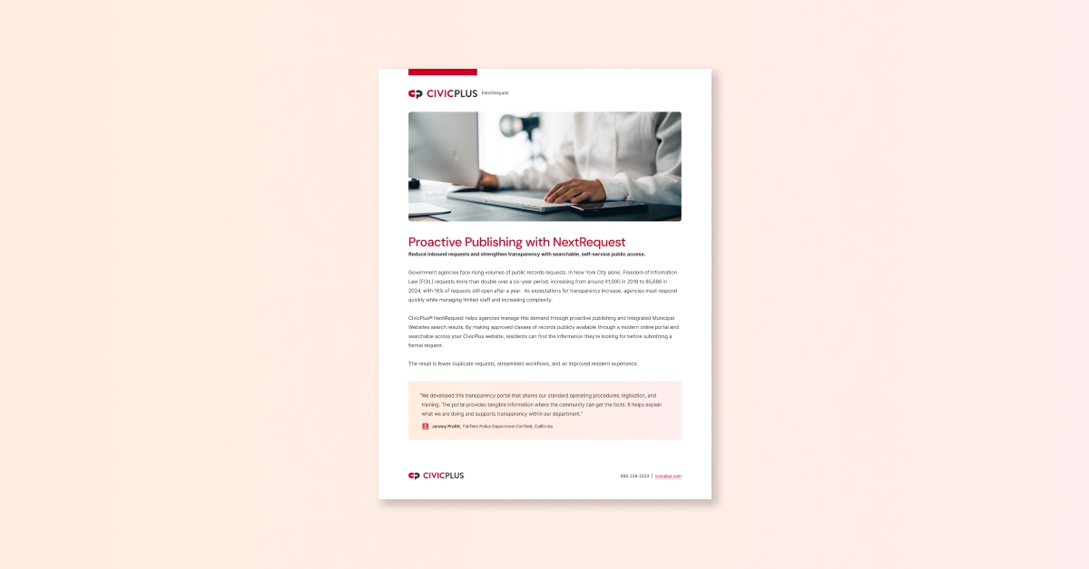 Public records requests are increasing, putting added pressure on staff and resources. Proactive publishing with CivicPlus NextRequest helps agencies make approved records publicly available and searchable, so residents can find information before submitting a request.