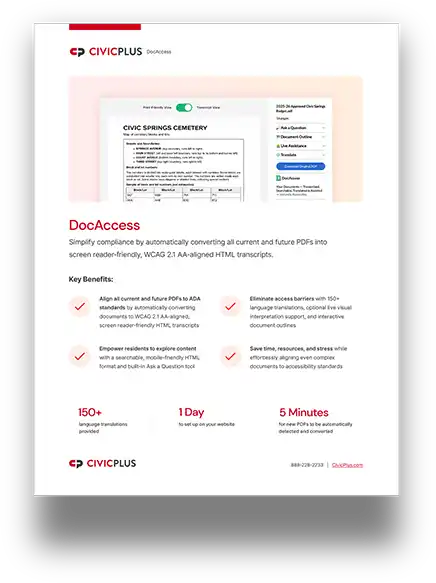 DocAccess is a PDF-to-HTML accessibility tool that automatically converts all current and future PDFs into WCAG 2.1 AA-aligned HTML transcripts. These screen reader–friendly transcripts are searchable, instantly translatable into over 150 languages, and qualify as an alternative format under federal guidelines. Download the fact sheet to learn more.