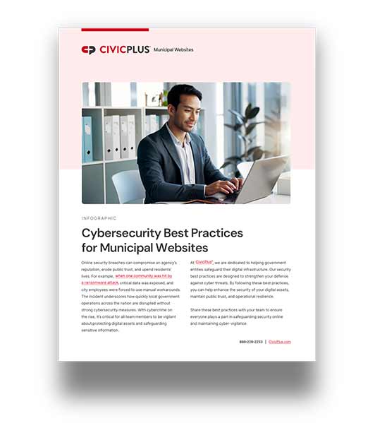By following the 8 Cybersecurity Best Practices From CivicPlus®, you can help enhance the security of your digital assets and residents’ information, maintaining public trust and operational resilience. In addition, we encourage you to share the infographic of best practices with your team to ensure everyone does their part to uphold the collective responsibility of cybersecurity by implementing proactive measures.