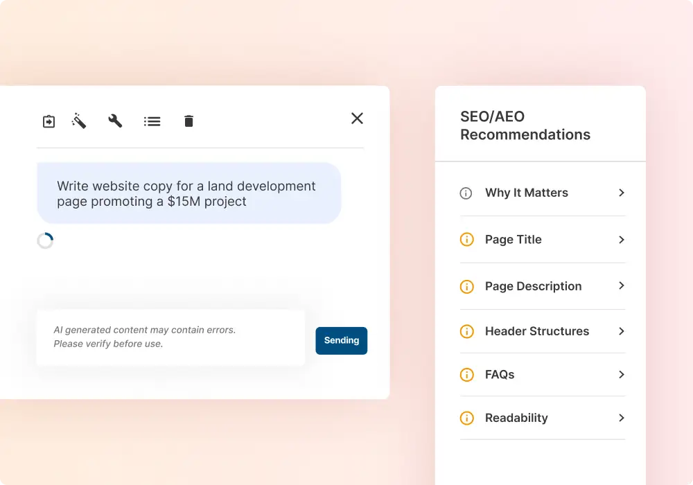 Save time and improve content quality with the AI Editing Assistant, a built-in tool that helps staff write, edit, summarize, and optimize website content without leaving their workflow. Get AI-driven recommendations with the AI Content Advisor to improve AEO (Answer Engine Optimization) and SEO (Search Engine Optimization) rankings through automated audits and reporting.