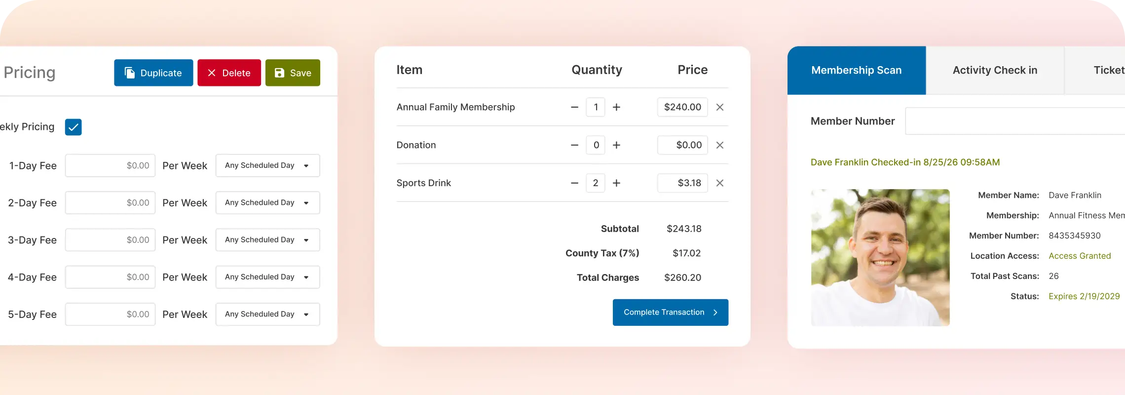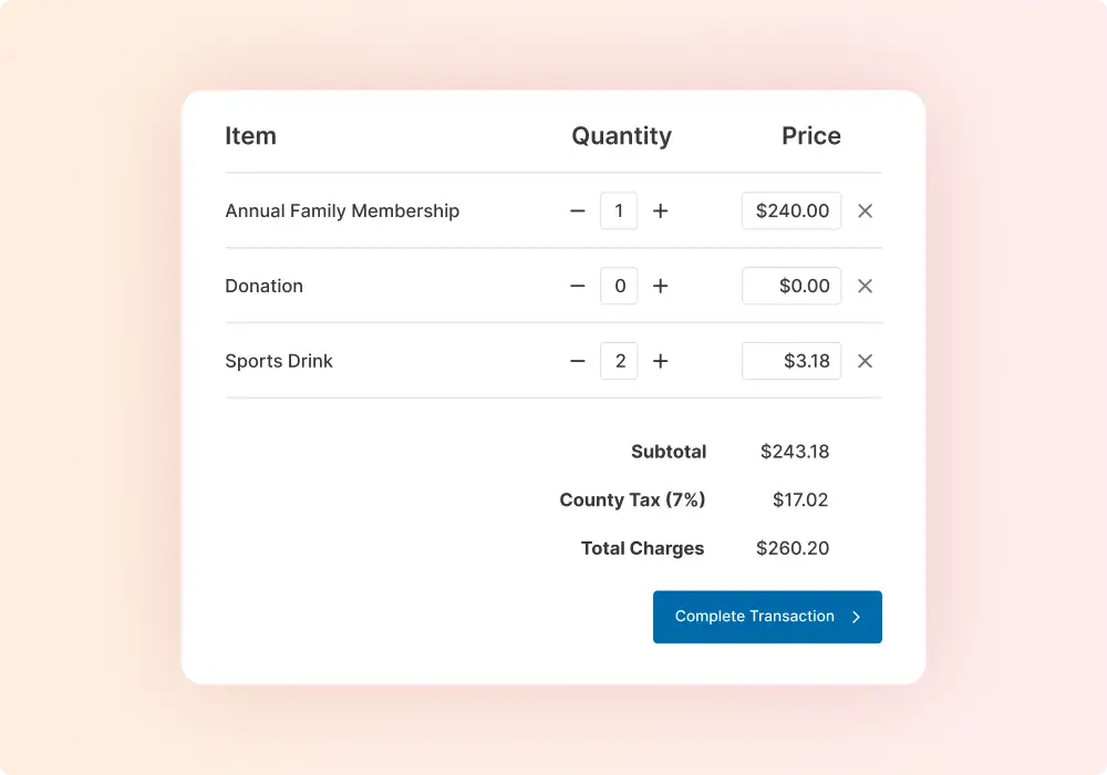 Accept in-person payments for drop-in activities, merchandise, concessions, and facility bookings with our POS system.