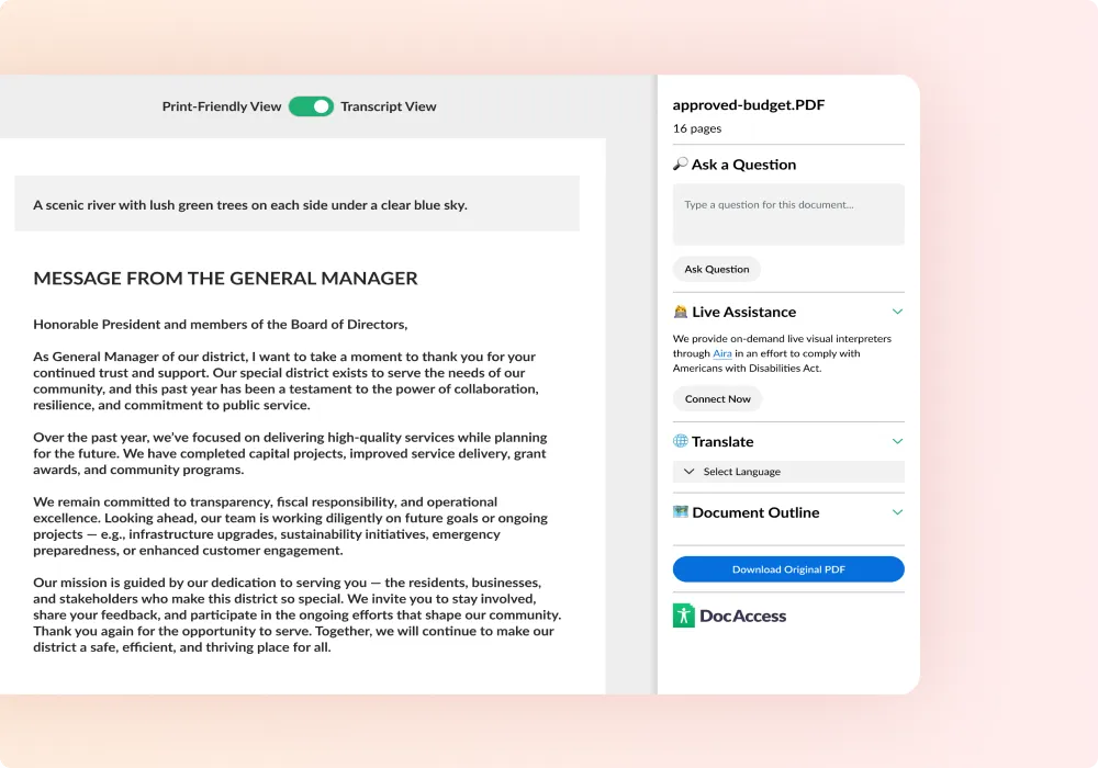 Simplify compliance by automatically converting all current and future PDFs into screen reader-friendly, WCAG 2.1 AA-aligned HTML transcripts.